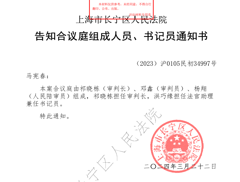 2. 一审审判组织组成不合法_邓鑫法官越权私自办案【211(七)】 《最高人民法院关于规范合议庭运行机制的意见》一、合议庭是人民法院的基本审判组织。三、合议庭审理案件时,审判长…还应当履行以下职责…。四、合议庭审理案件时,承办法官履行以下职责:(一)主持或者指导审判辅助人员做好庭前会议、庭前调解、证据交换等庭前准备工作及其他审判辅助工作。五、合议庭审理案件时,合议庭其他成员应当共同参与阅卷、庭审、评议等审判活动,根据审判长安排完成相应审判工作。 意思就是说案件是由合议庭审理的,没有合议庭,就没有审判组织,就不能审理案件;其他成员没有审判长安排不能私自超越管理权限办案。 (1)长宁法院合议庭组成时间不合法 立案时间: 2023年10月18日 |||《判决书》第1页。 ||| {证据}《告知合议庭组成人员、书记员通知书》,……本案合议庭由祁晓栋(审判长)、邓鑫(审判员)、杨翔(人民陪审员)组成,祁晓栋担任审判长,洪巧缘担任法官助理兼任书记员。特此通知。2024年3月22日。 (2)长宁法院审判员邓鑫法官在无合议庭时、在无审判长祁晓栋授权的情况下私自办案,两次越权主持证据交换。 ① 第一次证据交换时间:2023年12月18日。|||↑《判决书》第1页。 《笔录1》第1页,审(邓鑫):……,受合议庭委托,今天由审判员邓鑫主持双方进行证据交换,由书记员洪巧缘担任记录。||| {证据}《笔录1》 此时没有合议庭,更没有委托。邓鑫为何撒谎? ② 第二次证据交换时间:2024年1月18日。 《笔录2》第1页,审(邓鑫):……,受合议庭委托,今天由审判员邓鑫主持双方进行第二次证据交换,……||| {证据}《笔录2》 此时依然没有合议庭,也不可能有合议庭委托。为何还撒谎 ??