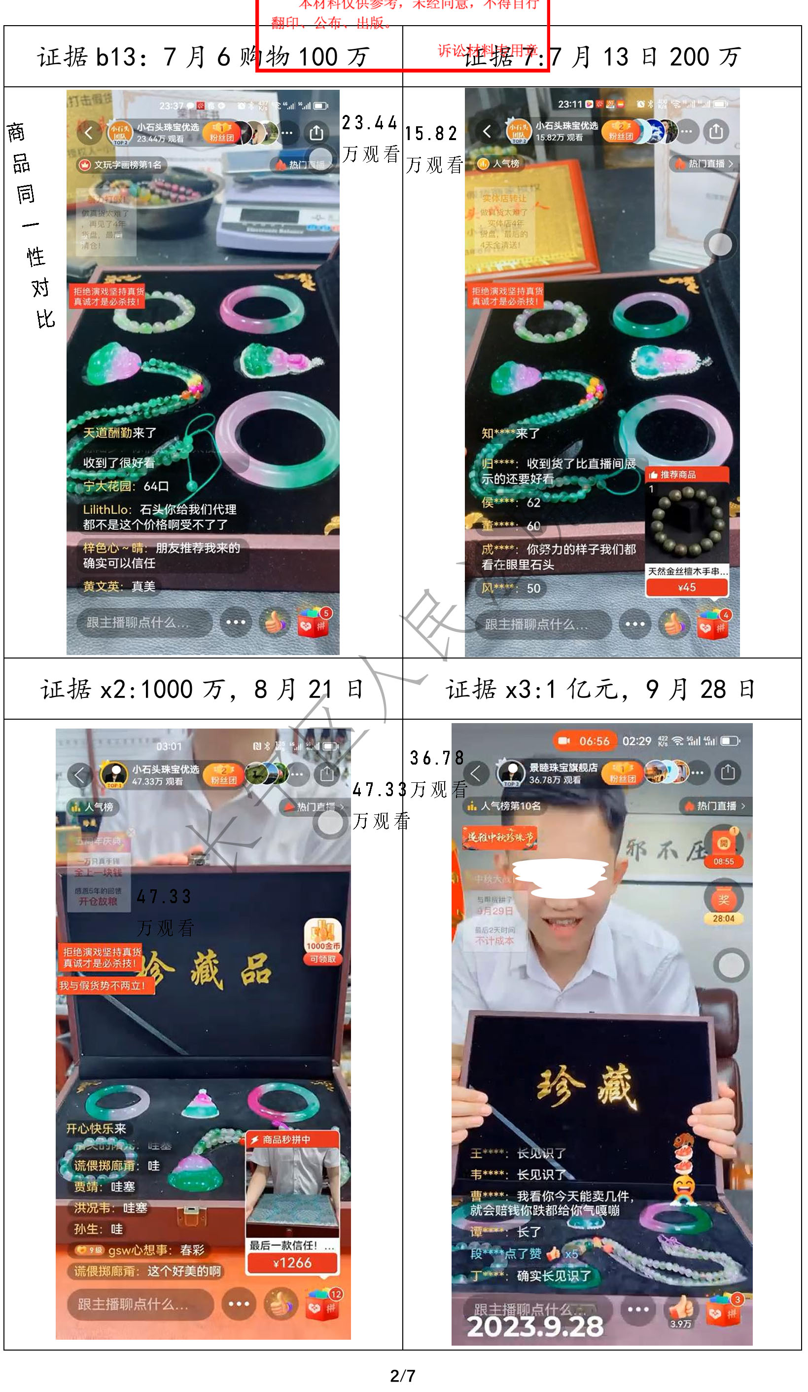 (1)可得利益损失赔偿有法律依据,不以任何“人”为标准,一审法官滥用自由裁量权,适用法律错误。【211(六)】 ①【法律依据】《民法典合同篇解释》第六十条 第三款 非违约方依法行使合同解除权但是未实施替代交易,主张按照违约行为发生后合理期间内合同履行地的市场价格与合同价格的差额确定合同履行后可以获得的利益的,人民法院应予支持。 ② 原告依法行使合同解除权但是未实施替代交易。|||↑25. 原告解除合同一审没有引述评论。 ③ 合同价格:7月6日合同原始价格100万元。↓(2)②. ④ 本案选择市场价格:8月21日价格1000万元。↓(2)②. ⑤ 差额:1000万元 一100万元 = 900万元。三套2700万元。||| 新法《民法典合同篇解释》在本案关键的时候又一次帮助了原告(天助4)。 (2)分析“其次,……与原告的损失及商家获利情况不符;” ① 原告损失的是“标的物”缅甸A货翡翠套装_合同初始价值100万元。 (i)《民法典》第595条 买卖合同是出卖人转移标的物的所有权于买受人,买受人支付价款的合同。 (ii)商品快照:核对交易细节时,可作为判断依据。 已选规格:缅甸a货高货冰种翡翠5件;——就是标的物。 该规格价格:¥1199.——就是价款!↑14. 真货合同成立 可以看出,“价款”买的是东西,不论该东西价值多少(价值是隐性的)。 (iii)原告依约支付价款,但收到假货,损失标的物(但买到所有权)。 “合同没有如约履行”,原告没有得到合格标的物。 ② 标的物增值 黄金、珠宝、玉石、房产等都具有保值、增值属性,这是生活常识。 而本案标的物“缅甸A货翡翠套装”也会随时间而涨价,7月6日合同原始价格100万元,8月21日价格上涨到1000万元。 原告在7月6日购买后,该缅甸A货翡翠套装多次升值情况: (i)7月13日晚间时B在直播间直播,这时标价200万;↓④(ii) (ii)8月21日凌晨时B直播间标价1000万;↓④(iii)【证据x2】; (iii)9月28日直播间宣称商品值一个亿;《判决书》第4页【证据x3】; (iv)10月30日直播间宣称商品值一千个亿。《判决书》第4页【证x4】。 ③ 市场价格的确定 房产价格多少需要专业鉴定,“翡翠套装”价格多少原则上也应当由专业鉴定。但是本案不用那么麻烦了,因为被告1独有该翡翠套装:《判决书》第4页,“8月20日直播间宣称商品值一千万视频及文字版”(“这种翡翠只有我店里面有”),被告1在直播间介绍商品的宣传价格(标价)就相当于市场价。俗语说“黄金有价玉无价”,被告1独有的翡翠套装他可以自己定价。 ④ 被告1在法庭进一步自认上述直播间宣传价格(↓),自认具有法律上的证据效力。 《民诉法解释》第九十二条 一方当事人在法庭审理中,……对于己不利的事实明确表示承认的,另一方当事人无需举证证明。 所以该价格从直播间宣传已经转变成为法庭自认的法律事实。 (i)《笔录2》第5-6页,被告自认直播间宣传的是真翡翠的价值100W: l 审:被告1提到的一百万级别何意? l 被1代:第一是一种宣传,第二这是真翡翠的价值。★★★ l 审:直播间右下角展示页面有“100W缅甸高货A货”? l 被1代:是直播间的一种宣传。 (ii)《笔录1》第10页,200万。 l 审:为何直播说商品是两百万,假货赔六百万? l 被1代:对真货翡翠的广告宣传。 (iii)《笔录2》第5页,1000万。 l 审:原告,值1000万、一个亿、一千个亿是何意? l 原:是后面直播间报的价格越来越高,8-21报1000万、 9-28报一个亿,10-30报一千亿。 l 审:被告1为何在直播间进行这样的报价? l 被1代:是直播间的宣传,后来1000万、一个亿、一千个亿也不是涉案直播间(撒谎)。 ||| 注:1000万是涉案直播间(↓同一性图)(前三个本案直播间, 最后一个是诉讼中被告又新开的直播间《景睦珠宝旗舰店》,换个 马甲继续坑爹)见↑24. 法官遗漏视频证据。 l 审:直播人是否为被告1 ? l 被1代:是的。但不是涉案商品。||| 四次宣传都是涉案商品↓图。 商品同一性图 另《判决书》第12页认定本案相同商品: “另查明,原告曾参与被告时B与本案相同商品的案外直播。……两百万级别”、“上到过千万”、“拍卖会上过亿”。||| 根据被告1对100万、200万的自认,可以看出其直播间宣传的是真货价格,这是被告1的交易宣传习惯。根据交易习惯,可以推定其1000万、一个亿的宣传也是对真货标的物价格的宣传。 u 自认具有法律效力。 u 法律事实:2023年8月21日市场价1000万。
