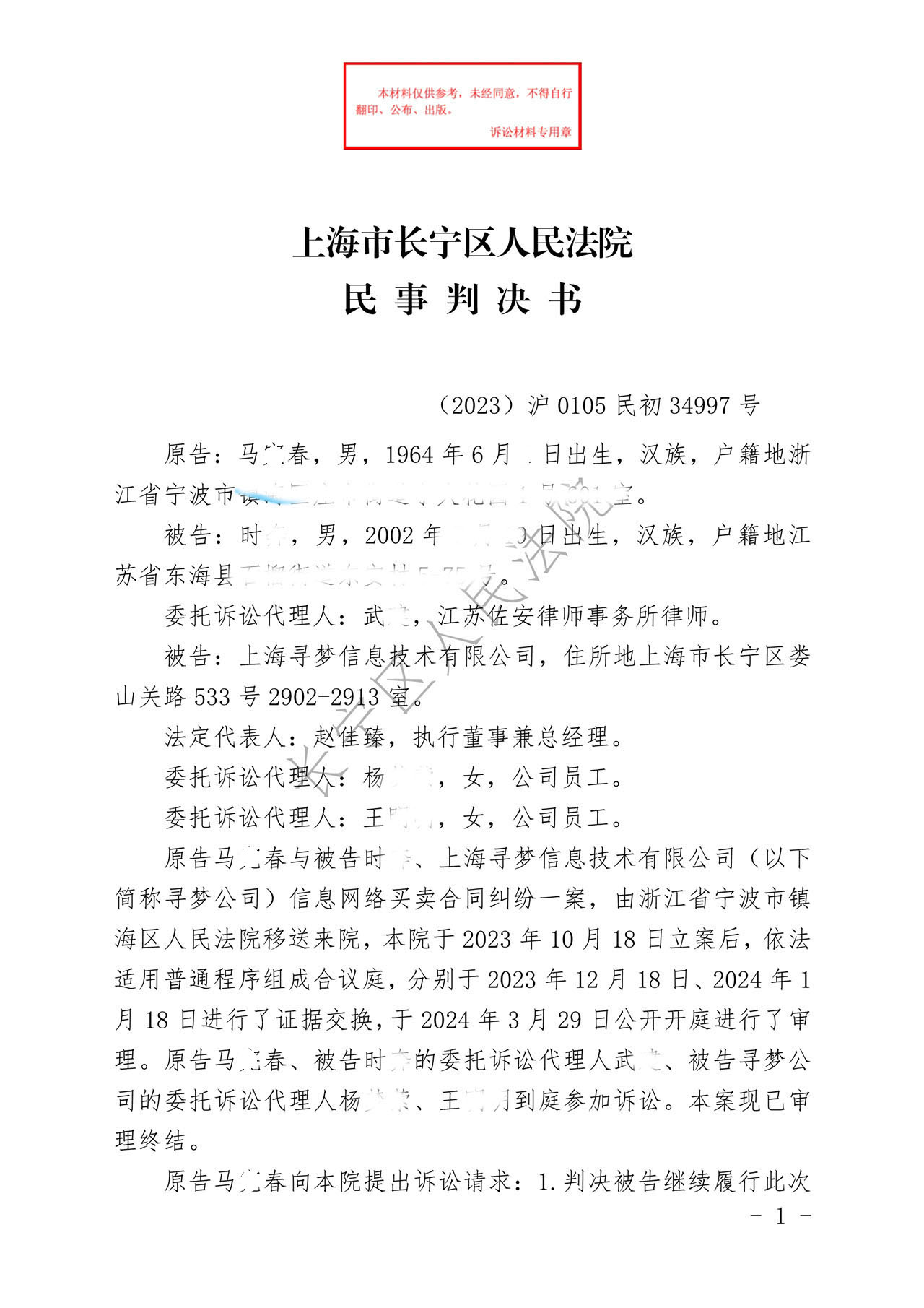原告马*春与被告时B、上海寻梦信息技术有限公司(以下简称寻梦公司)信息网络买卖合同纠纷一案,由浙江省宁波市镇海区人民法院移送来院,本院于2023年10月18日立案后,依法适用普通程序组成合议庭, 分别于2023年12月18日、2024年1月18日进行了证据交换,于2024年3月29日公开开庭进行了审理。原告马宪春、被告时B的委托诉讼代理人武J、被告寻梦公司的委托诉讼代理人杨MM、王MM到庭参加诉讼。本案现已审理终结。